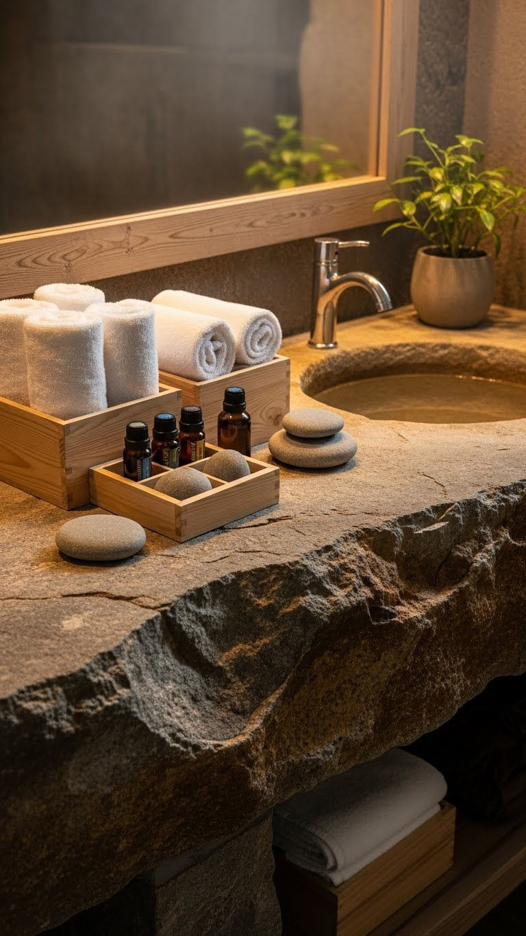Wood and stone together create a grounded, spa-like feel. Ever noticed how natural materials instantly calm a room?