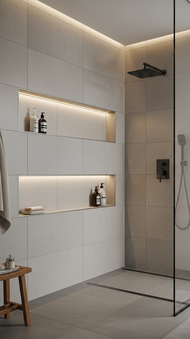 A contrasting tile inside the niche adds subtle personality without going overboard. Want bonus points? Add waterproof LED strip lighting. It looks expensive and helps you find products during early mornings when your brain hasn’t booted up yet 🙂