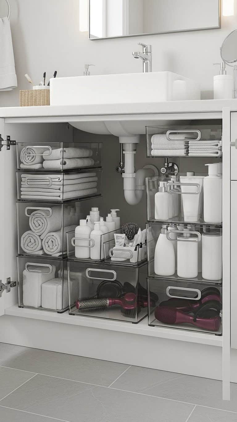 IMO, clear bins suit minimalist and modern bathrooms best. If you love clean lines and hate visual noise, this setup just makes sense. Why hide things when you can organize them beautifully?