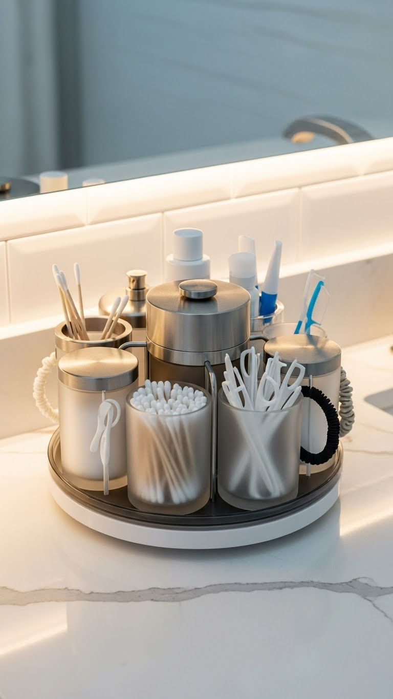 Rotating vanity storage containers feel like cheating—in a good way. I use one because spinning instead of digging saves time and sanity. Everything stays visible, accessible, and oddly satisfying to use.