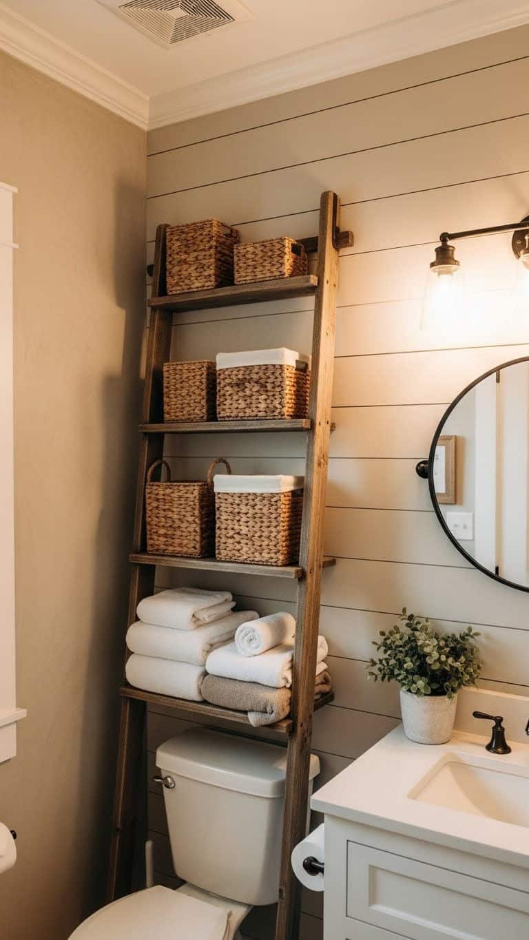 Use woven baskets on the lower rungs for toilet paper and cleaning supplies. Place folded towels and a small plant higher up. The vertical design draws the eye upward, which makes the bathroom feel larger—sneaky, right?