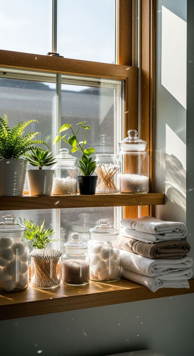 If your RV bathroom has a window, don’t waste that ledge. I use mine for jars, plants, and small containers, and it looks surprisingly intentional.