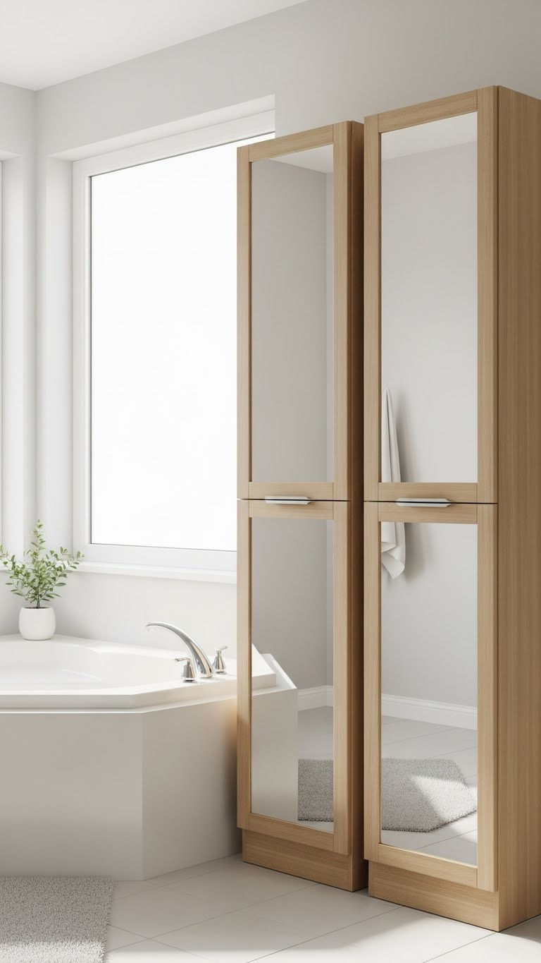 Mirror-front cabinets pull double duty. They hide storage and reflect light, which instantly makes the bathroom feel bigger. I’ve used mirrored storage before, and the difference feels dramatic.