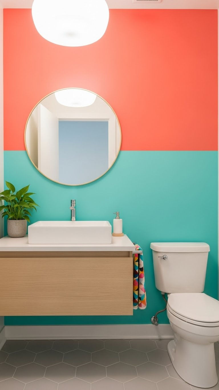 Color blocking brings fun into a half bathroom without chaos. A bold color block accent wall lets you play with contrast while keeping structure. I love this for people who want personality without patterns.