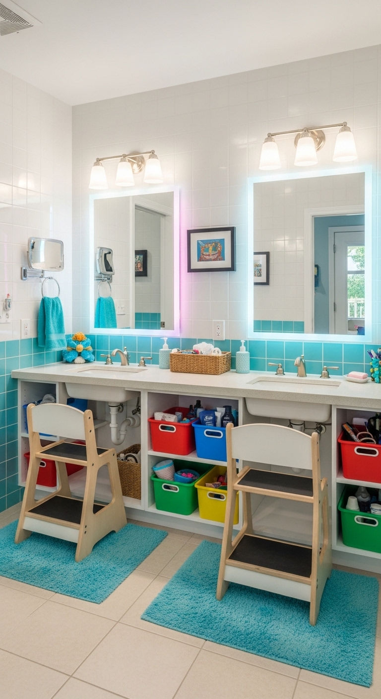 That space under the sink usually becomes a disaster zone. Turning it into a toy hideaway completely changes how the bathroom feels. Pull-out baskets keep toys accessible but hidden, which instantly reduces visual clutter.