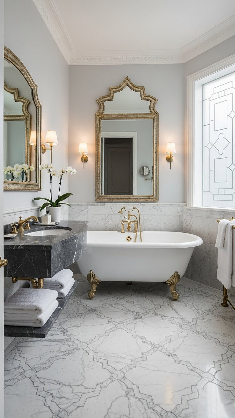 Marble bathroom tile floors paired with brass fixtures feel instantly elevated. I always smile when I see this combo because it feels intentional and warm at the same time. White or cream marble gives brass room to shine without overpowering the space.